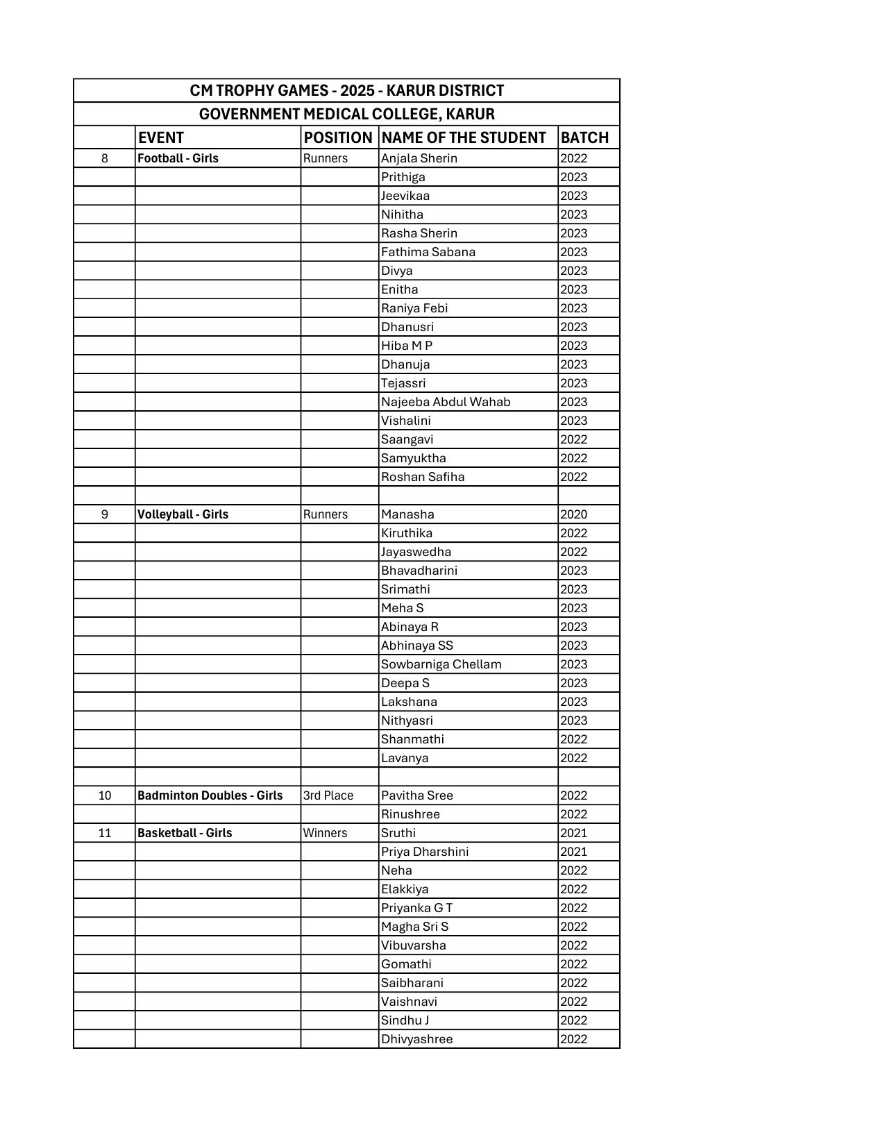 LIST OF CM SPORTS TROPHY WINNERS - 2025 (GIRLS)